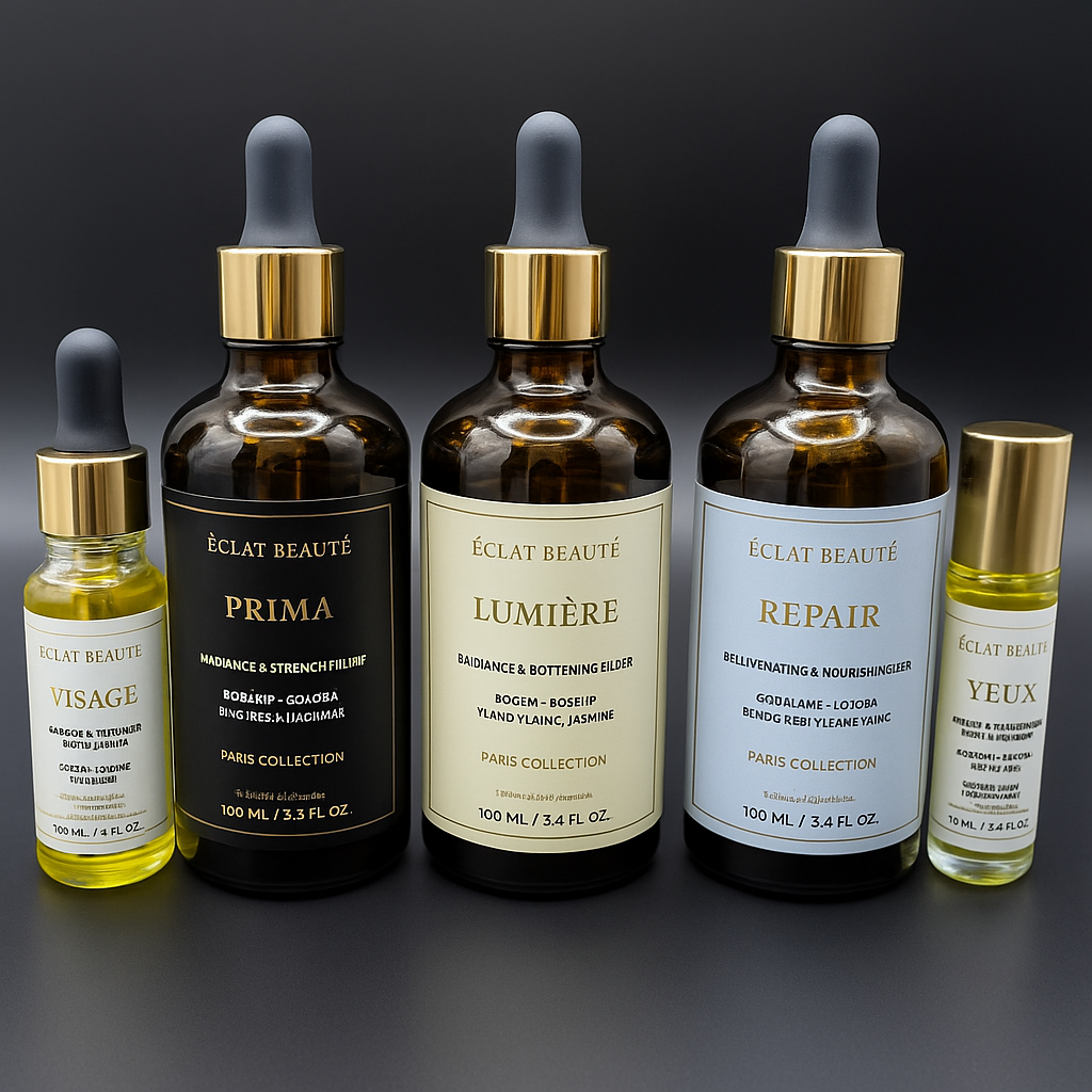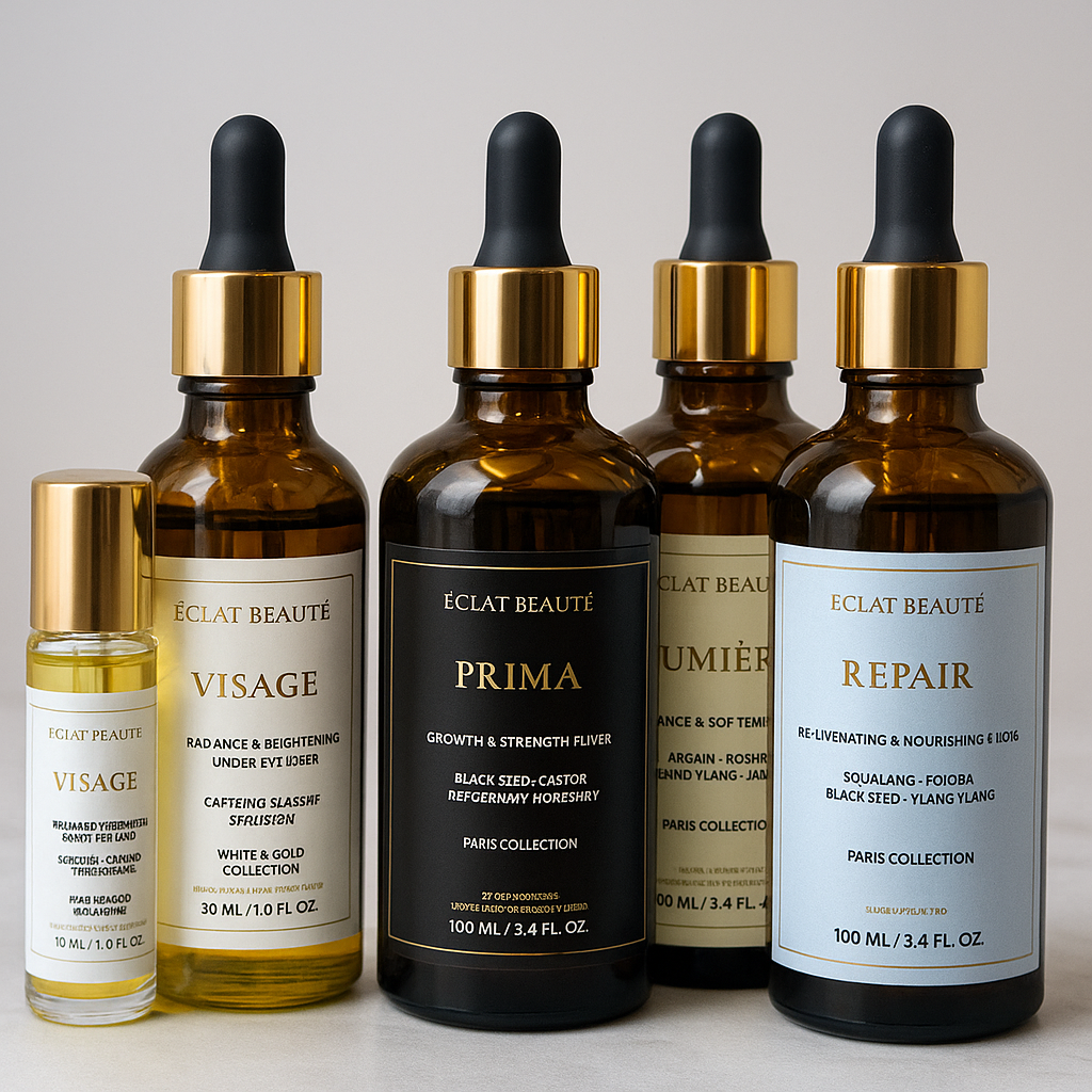 Experience the complete ÉCLAT ritual with all five luxury elixirs for hair, face, and eyes. The Paris Collection brings together our signature treatments: